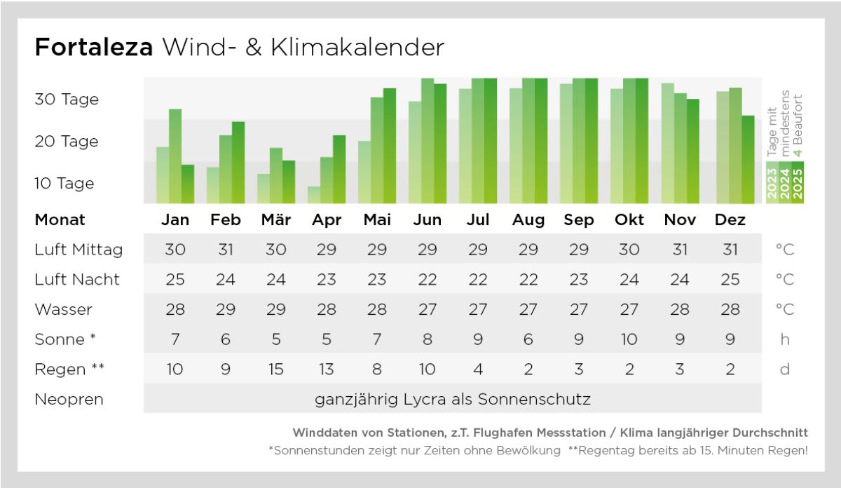 Der Wind kommt am gesamten Küstenstreifen meistens Side-Onshore von rechts. Er bläst sehr gleichmäßig, teilweise 24 Stunden am Tag. Die meistgeflogenen Kitegrößen sind hier 9qm bis 11qm. Zwischen Mitte Juli und Ende Januar gibt es eine sehr hohe Windwahrscheinlichkeit. In den restlichen Monaten hat man immerhin noch eine 50-60%ige Windhäufigkeit. Nur Regen kann den Wind für kurze Zeit sterben lassen. Dies geschieht im März/April am häufigsten.