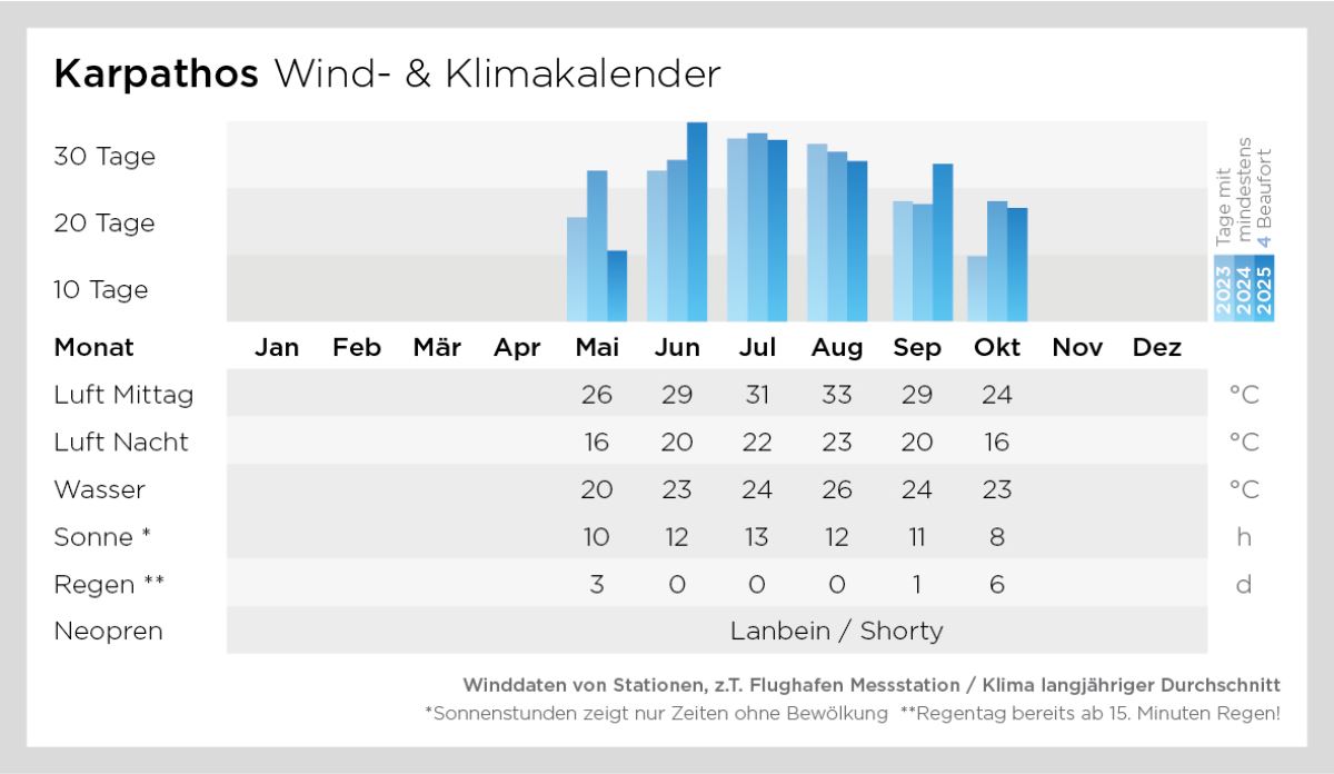 Karpathos ist ideal für Surfer und Kiter, die es gerne etwas ruhiger haben und die echte griechische Ursprünglichkeit suchen. Vor allem aber ein Highlight für Starkwindfans in den Monaten Juli bis Mitte September.
